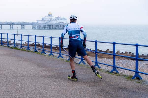 One young GB Biathlete, Jack White, a former pupil of Heathfield Community College and Bede’s can regularly be spotted training on a stretch of East Sussex seafront at Eastbourne. For UK training, rollerskiing on tarmac is used to imitate the skiing technique. The sight of him polling down on rubber wheels can still stop passers-by in their tracks. For Jack, the seafront promenade and local cyclepath between Polegate and Lewes provide smooth surfaces and solid training ground for international sporting ambition. With hills, corners and long flats that has carried him from the Sussex to Scandinavia and Central Europe.