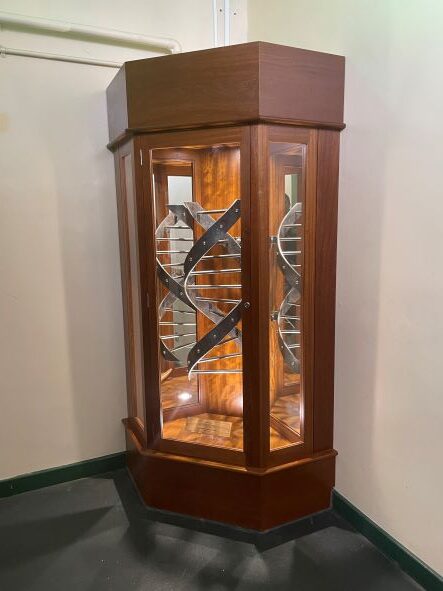 Following his passing the College commissioned a hand-crafted memorial in the style of a DNA Helix following discussions with the family and persevered through lockdowns to ensure it was handmade by a local craftsman. Encased in this beautiful cabinet made from wood from science desks removed from Labs 1-3 when they were refurbished last summer, the memorial is every inch a product of the College, even the plaque inside is renovated from the heritage wooden flooring engraved by our own technicians. As such it seems fitting that Chris’s memorial is mounted on the science corridor, encased by the science department he knew and loved, for students past, current and future to know, respect and be inspired by.
