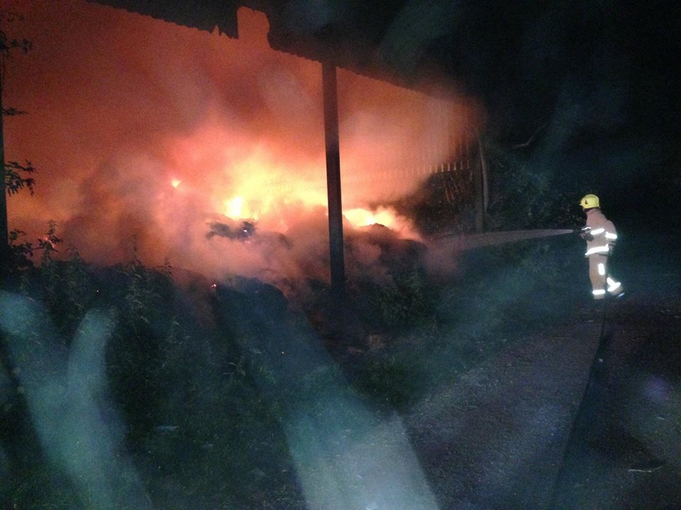 I don’t think it coincidence that a cyclist came down at half past midnight on his bike, clearly smoking. Thanks who ever you are. Three fire engines and many fire fighters were in attendance until 6 a.m. and are having to come back several times today to damp it back down and we have lost all our hay barn. Our main problem is that we have no hay for our horses now and nowhere to put the hay we are about to harvest.