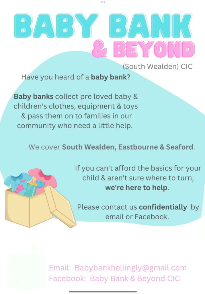 We are now known as Baby Bank & Beyond (South Wealden) CIC and although I still operate mainly from my home in Hellingly , I’m now joined by my daughter Amy who has a background in Social Services Early Years Intervention. Her support in signposting families to other agencies – like the Family Centres, Uniform Banks and Community Fridges has been invaluable.